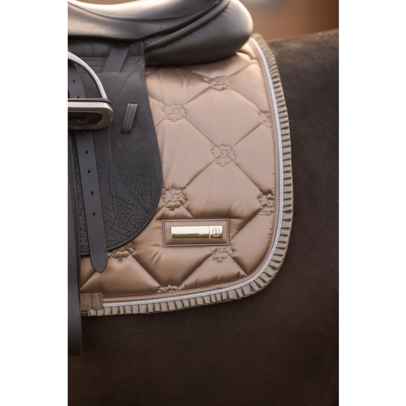 Elegante Schabracke mit Königssteppung, Mesh-Rückenleine und gravierbarer Metallplakette an der linken Seite. Für ein hervorragendes Feuchtigkeitsmanagement mit technischem Futter.