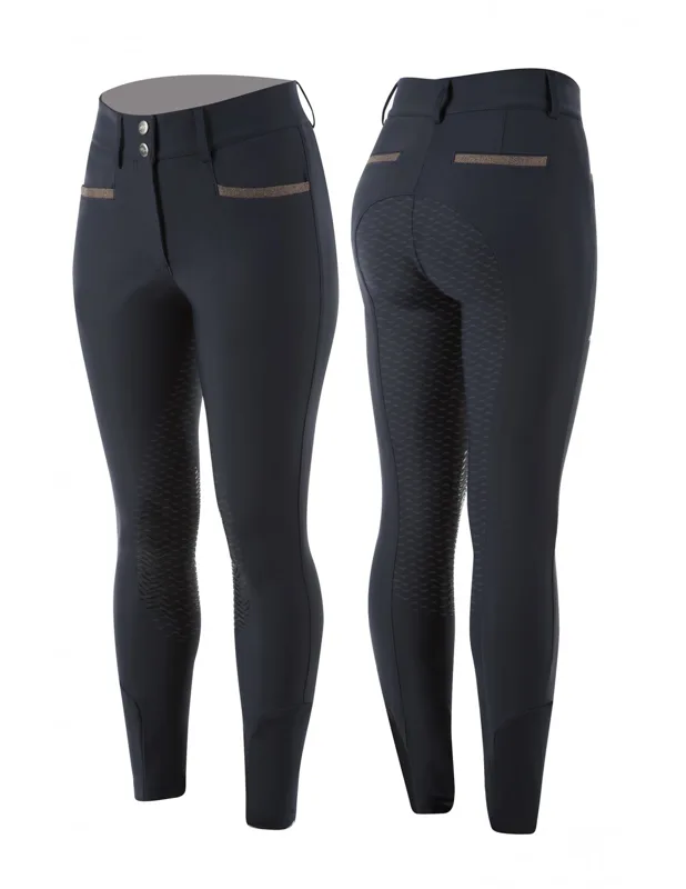 Schöne Reithose mit vielen modischen Details. Die tiefen Fronttaschen sowie die Gesässtaschen sind mit einem braunen Band veredelt. Der innovative Voll-Grip-Besatz garantiert einen guten Halt im Sattel. Die Hose besteht aus 82% Nylon und 18% Elasthan – ein moderner, schnelltrocknender und pflegeleichter Stoff